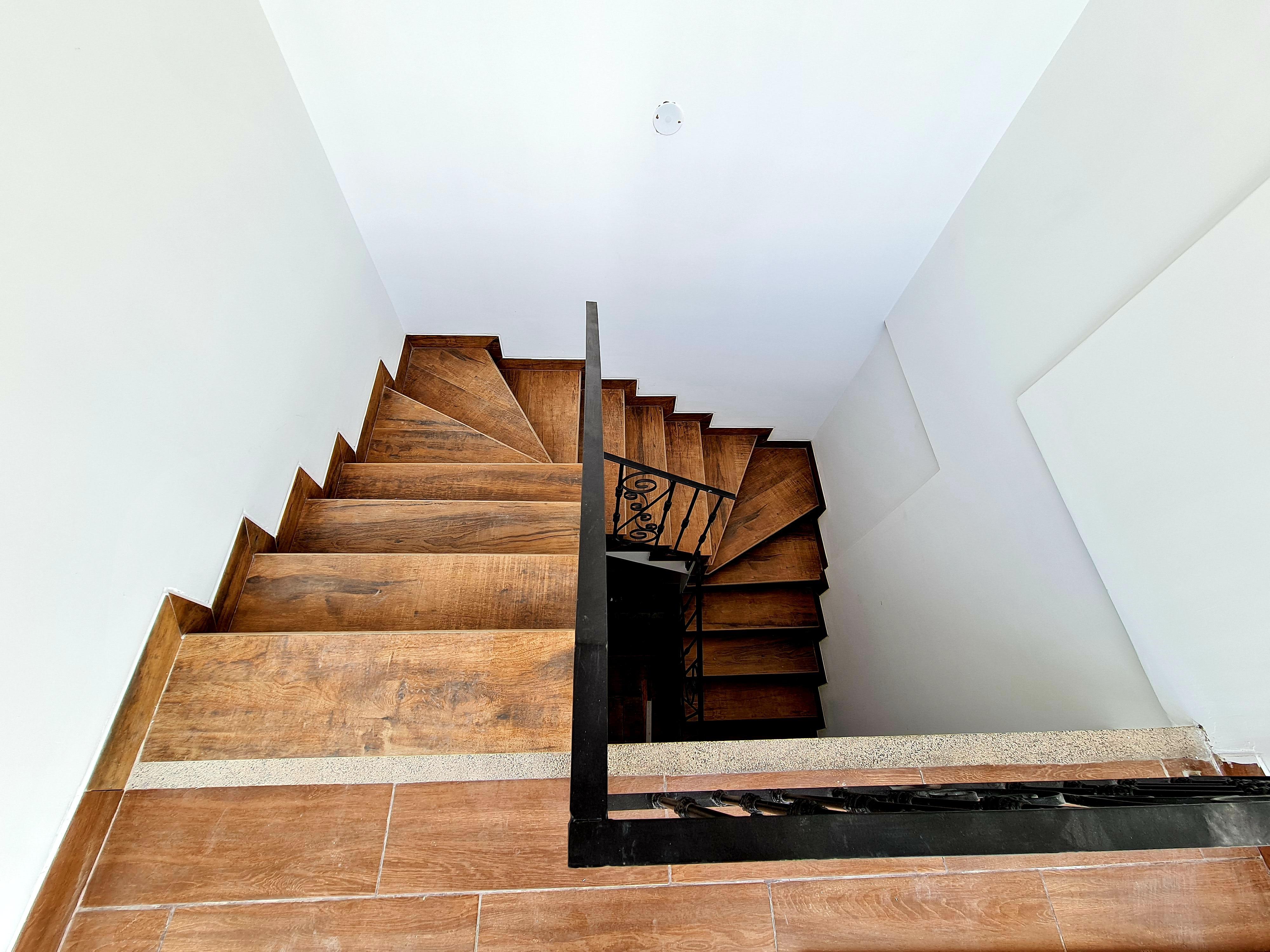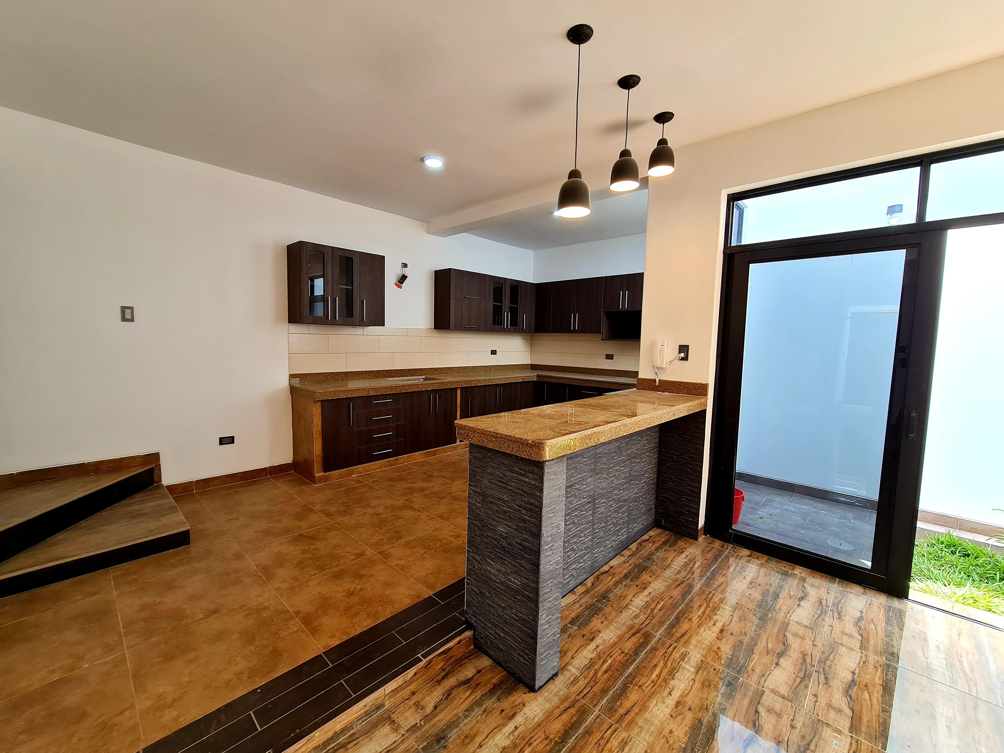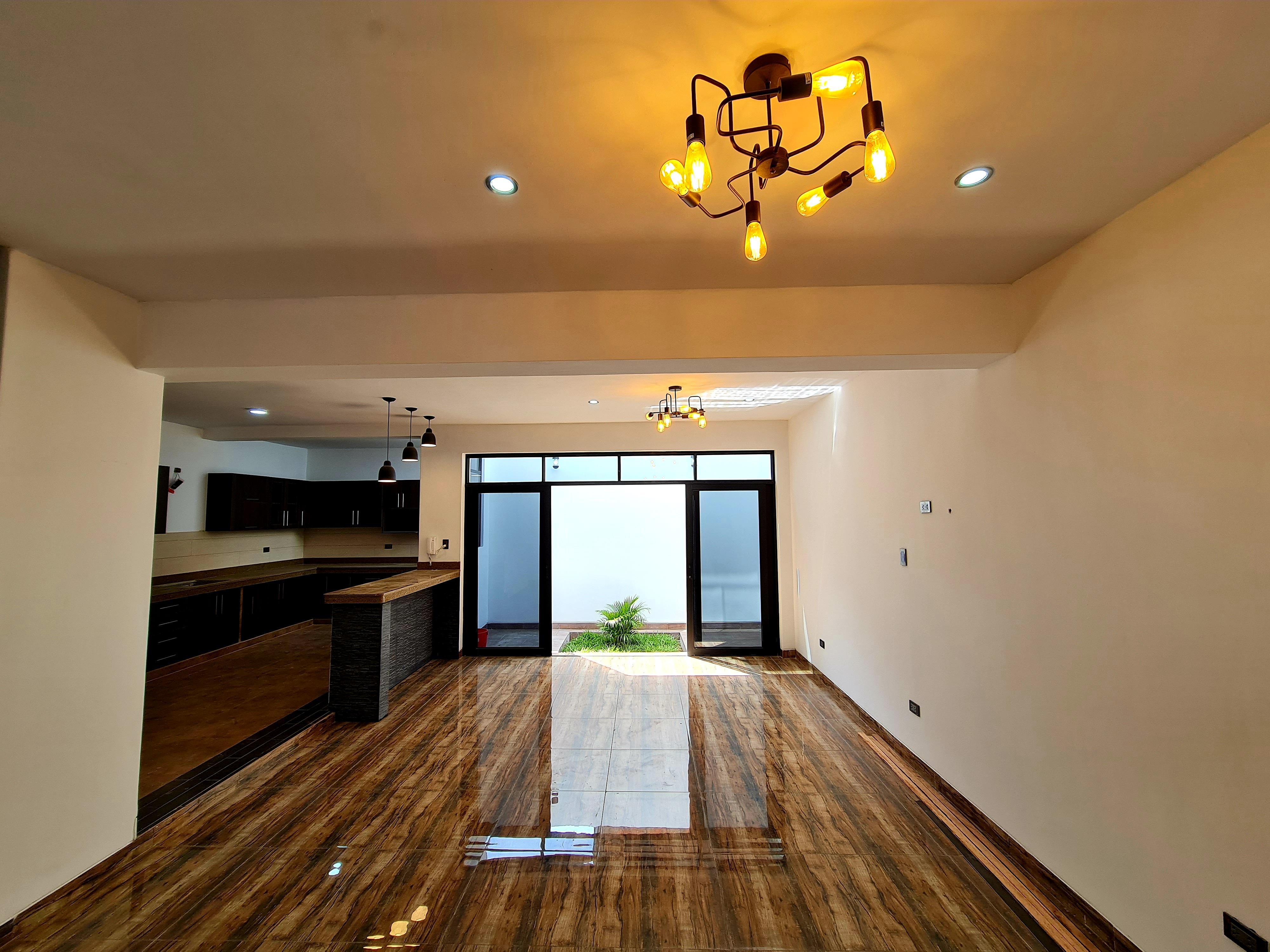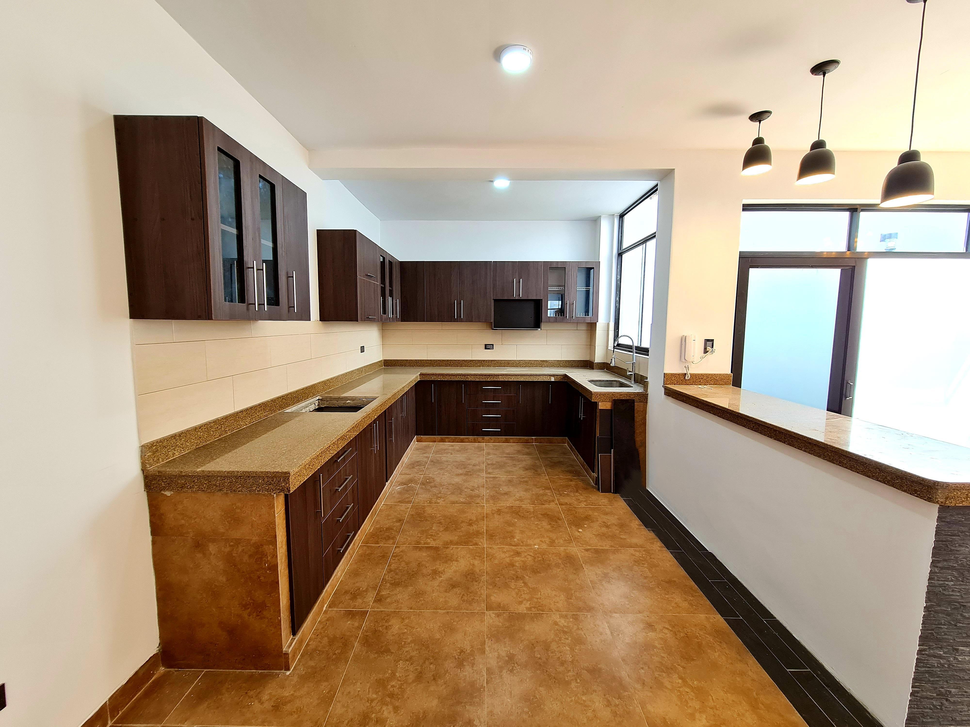 primer piso: cochera, estudio, baño completo, amplia sala comedor, cocina equipada (encimera, reposteros y campana), terraza.