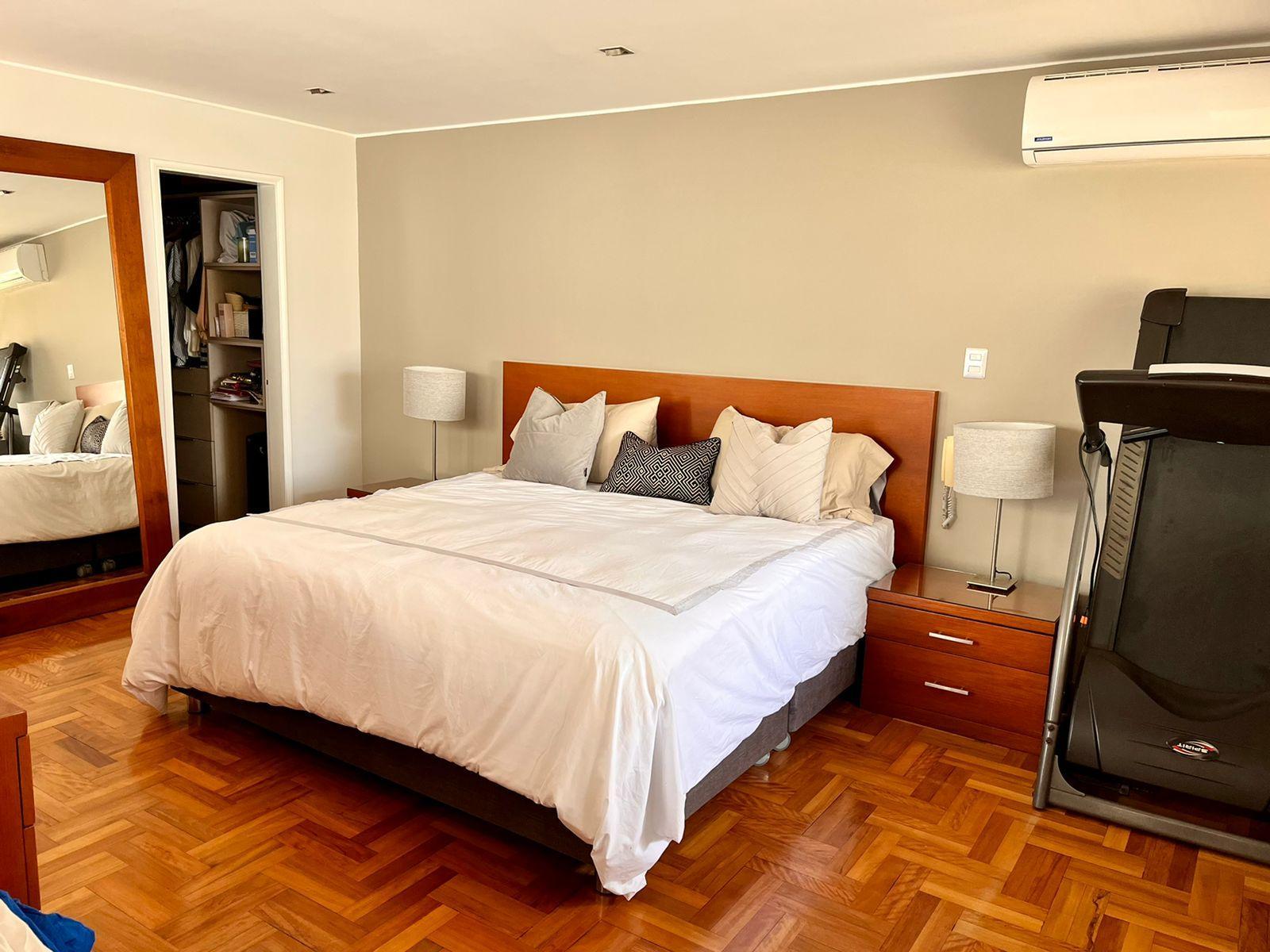 Piso 2: Dormitorio principal cama King size y Aire Acondicionado nuevo, con walking closet y baño completo incorporado con tina con hidromasajes.