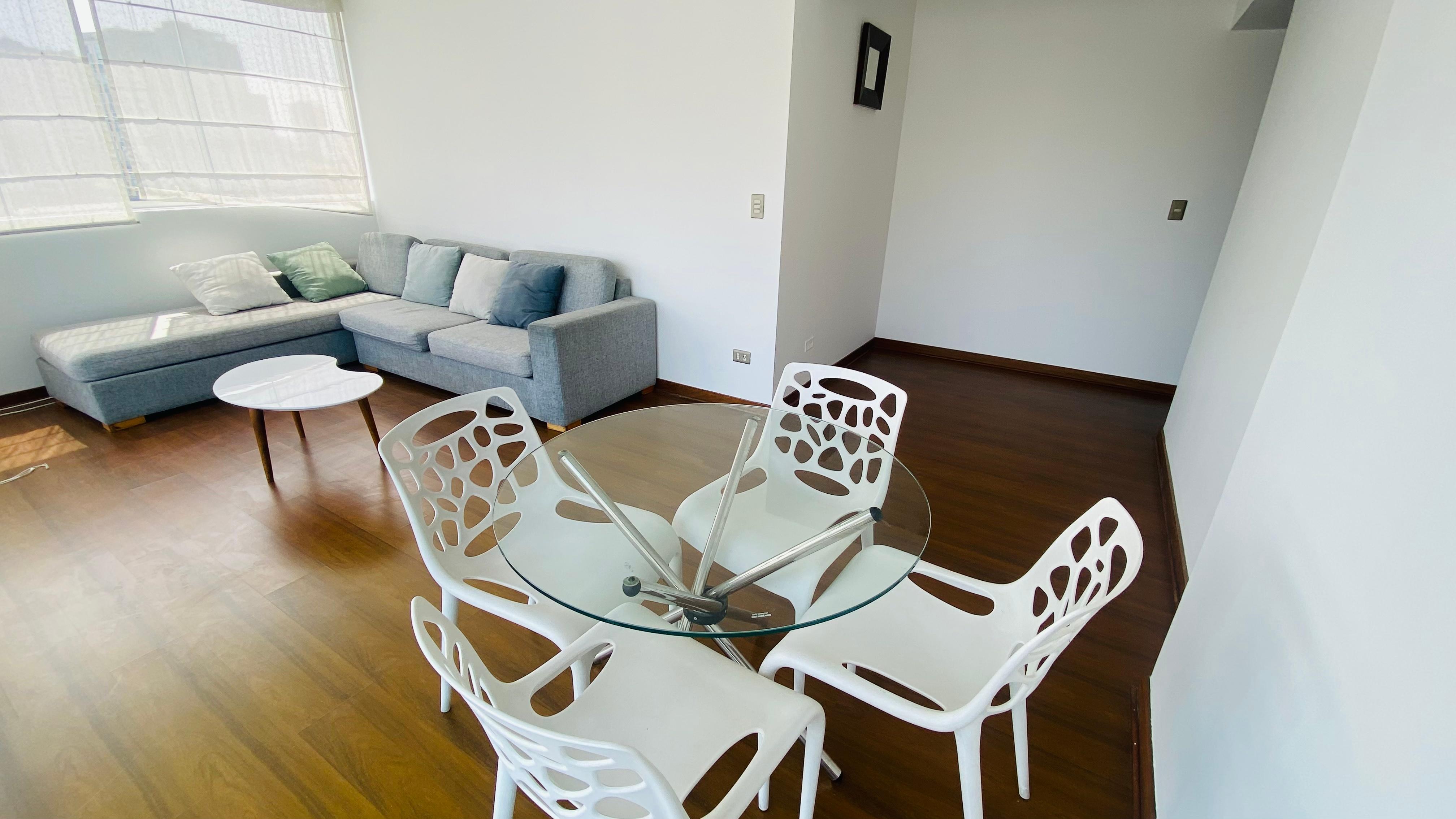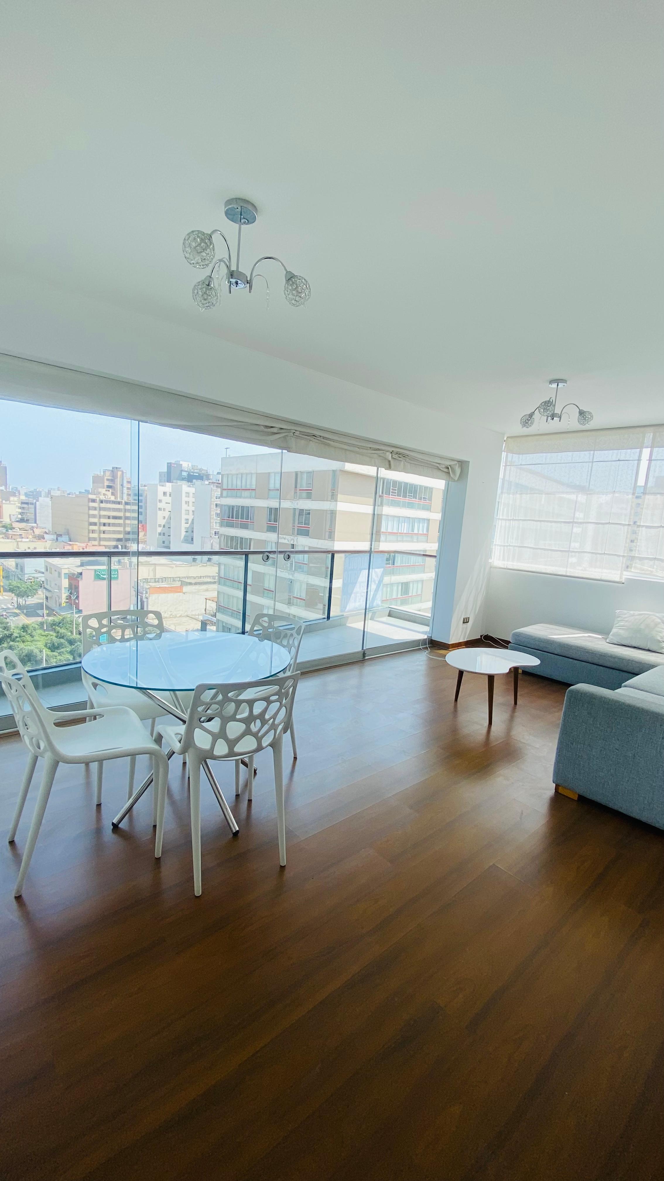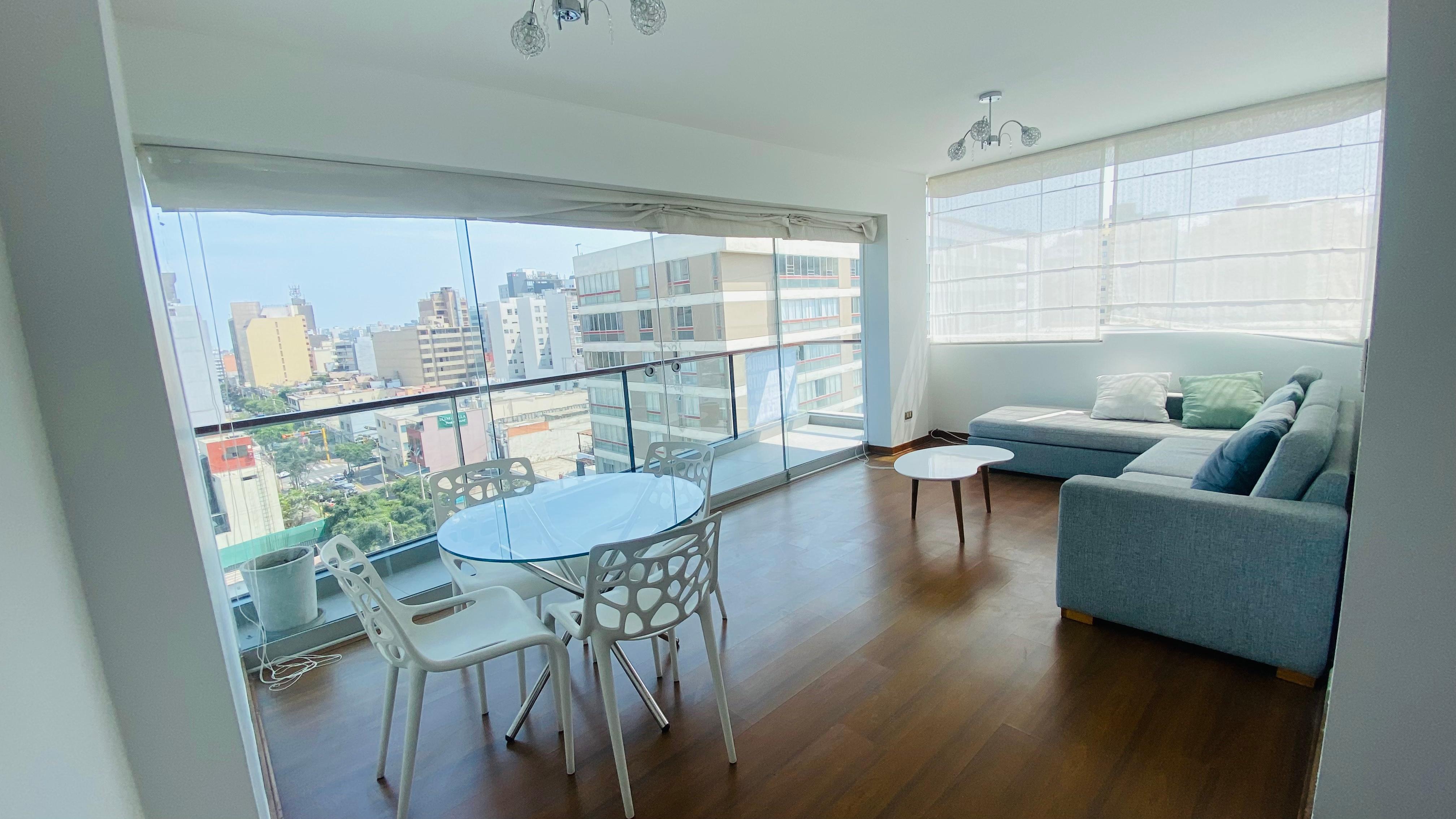 Alquilo exclusivo departamento totalmente amoblado y equipado en la mejor zona de Miraflores esquina de Grimaldo del sola con Schell , de 3 dormitorios , 2 balcones , cuarto y baño de servicio , dormitorio principal con walcking closet y balcon , cochera , el edificio tiene hall de ingreso y area de recepcion