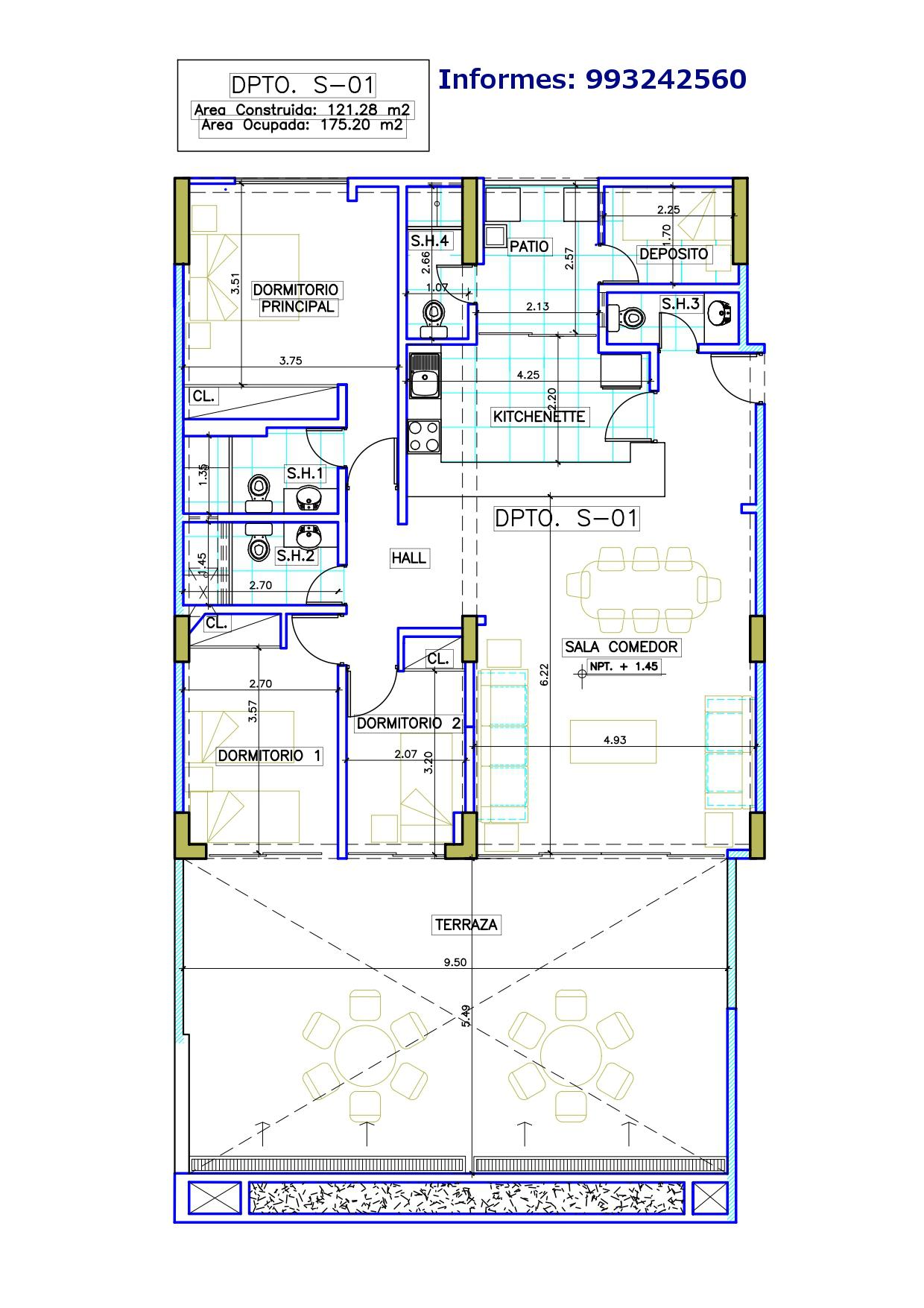 El Flat tiene una terraza bastante grande de 54 m2 de área que colinda con la sala-comedor y dormitorios dando bastante iluminación natural a esos ambientes. Cuenta con 3 dormitorios + cuarto de servicio, amplia sala-comedor y cocina, 3 baños completos + baño de visita, y área de lavandería. El departamento se vende con 2 estacionamientos.