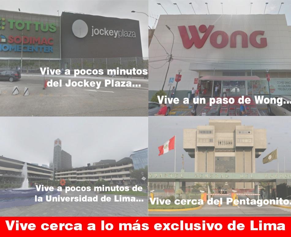 Vive a pocos minutos del Jockey Plaza, la Universidad de Lima, la UPC, El Pentagonito, C.C. Caminos del Inca, a un paso de supermercado Wong de Chacarilla, rodeado de restaurantes de cocina gourmet, hermosos parques, y centros médicos.